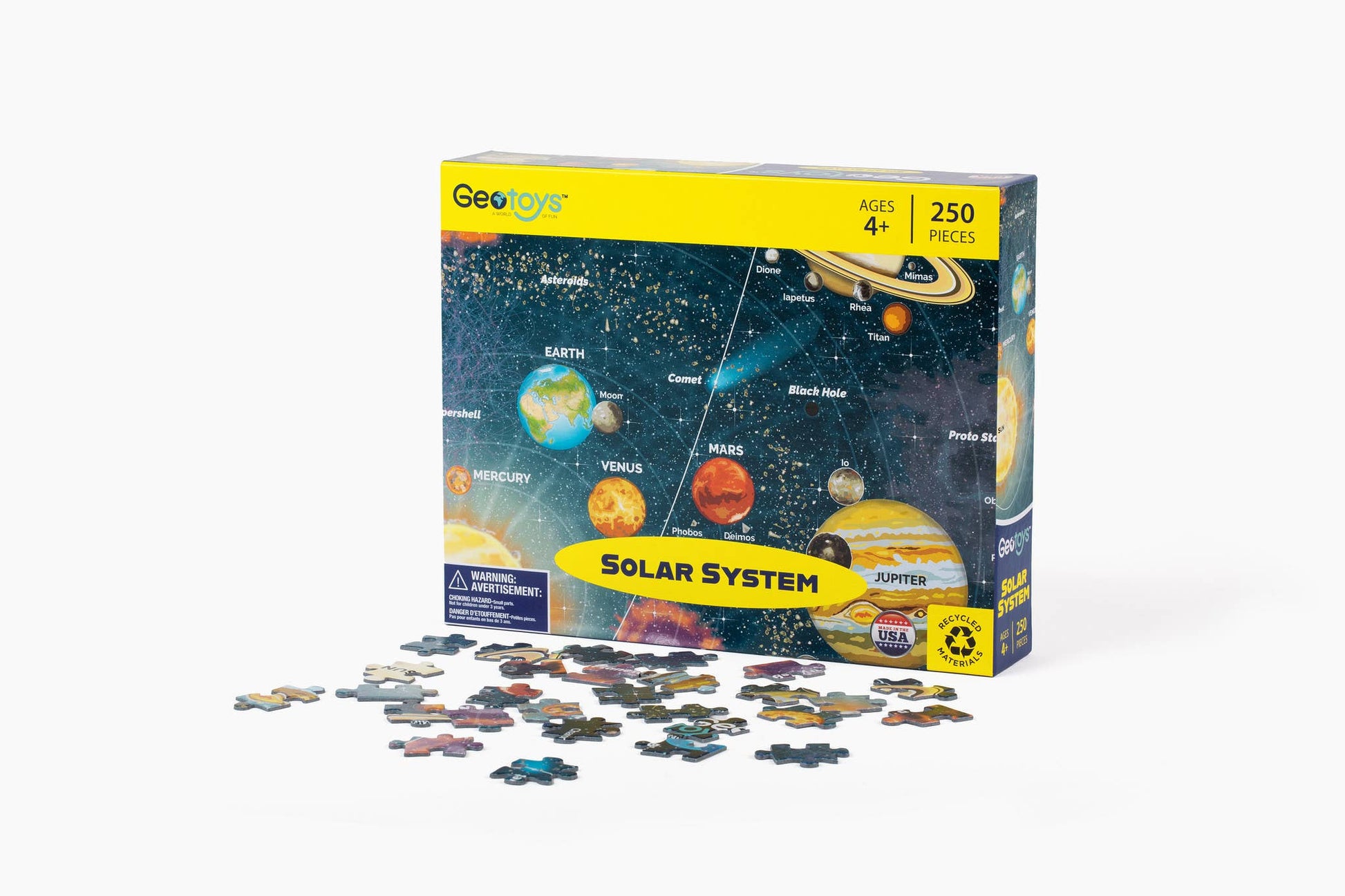 Geotoys’ puzzles have taken kids and adults all around the world. Now we’re taking you far beyond - to explore the entire solar system! Our new Solar System puzzle is an original illustration, and includes all planets and major stars in our solar system. It also showcases asteroids, comets, and gas giants - all in vibrant color. 250 pieces, for ages 5+.
